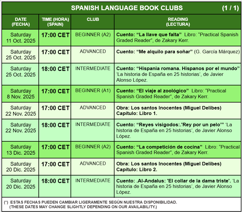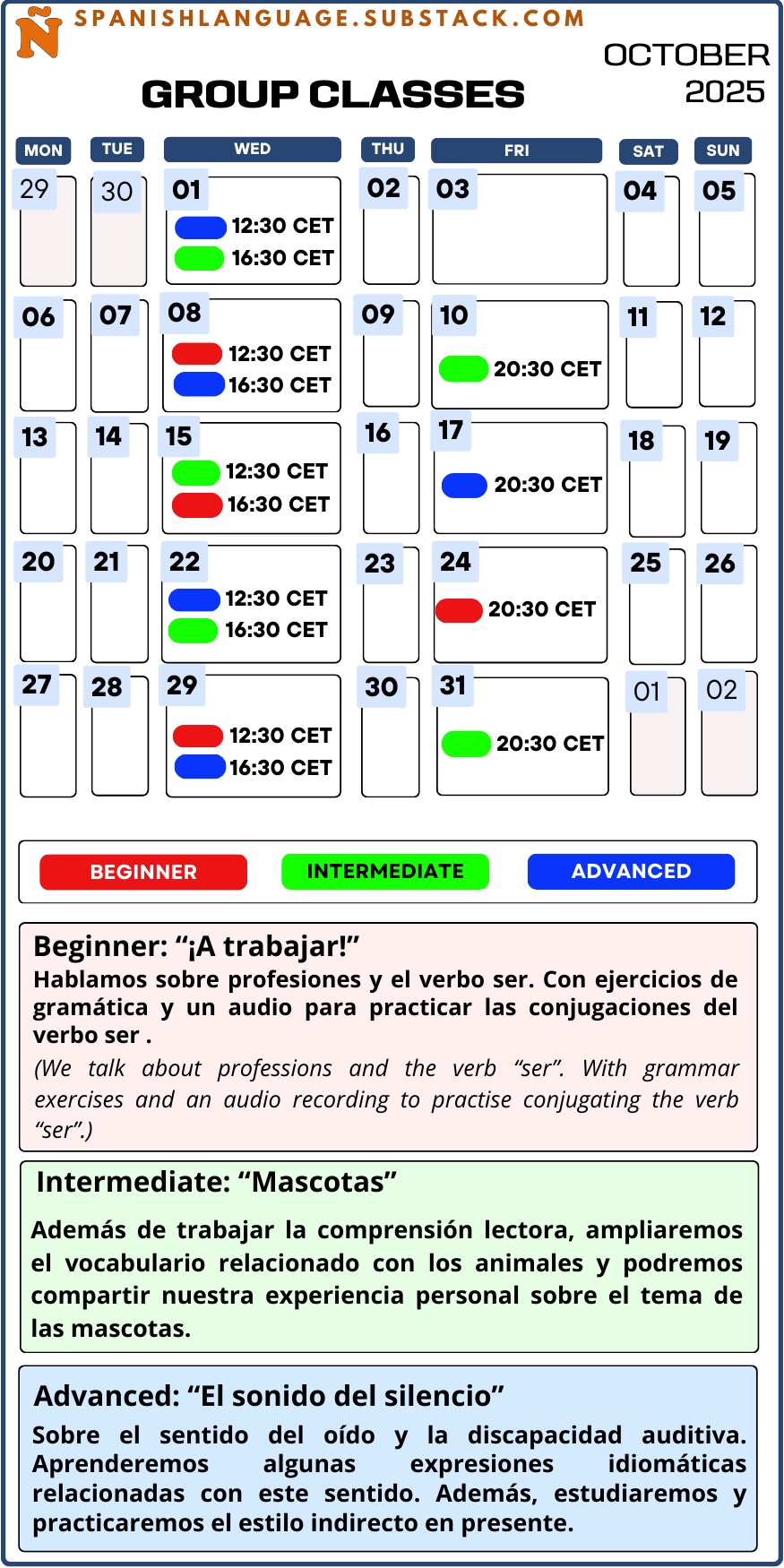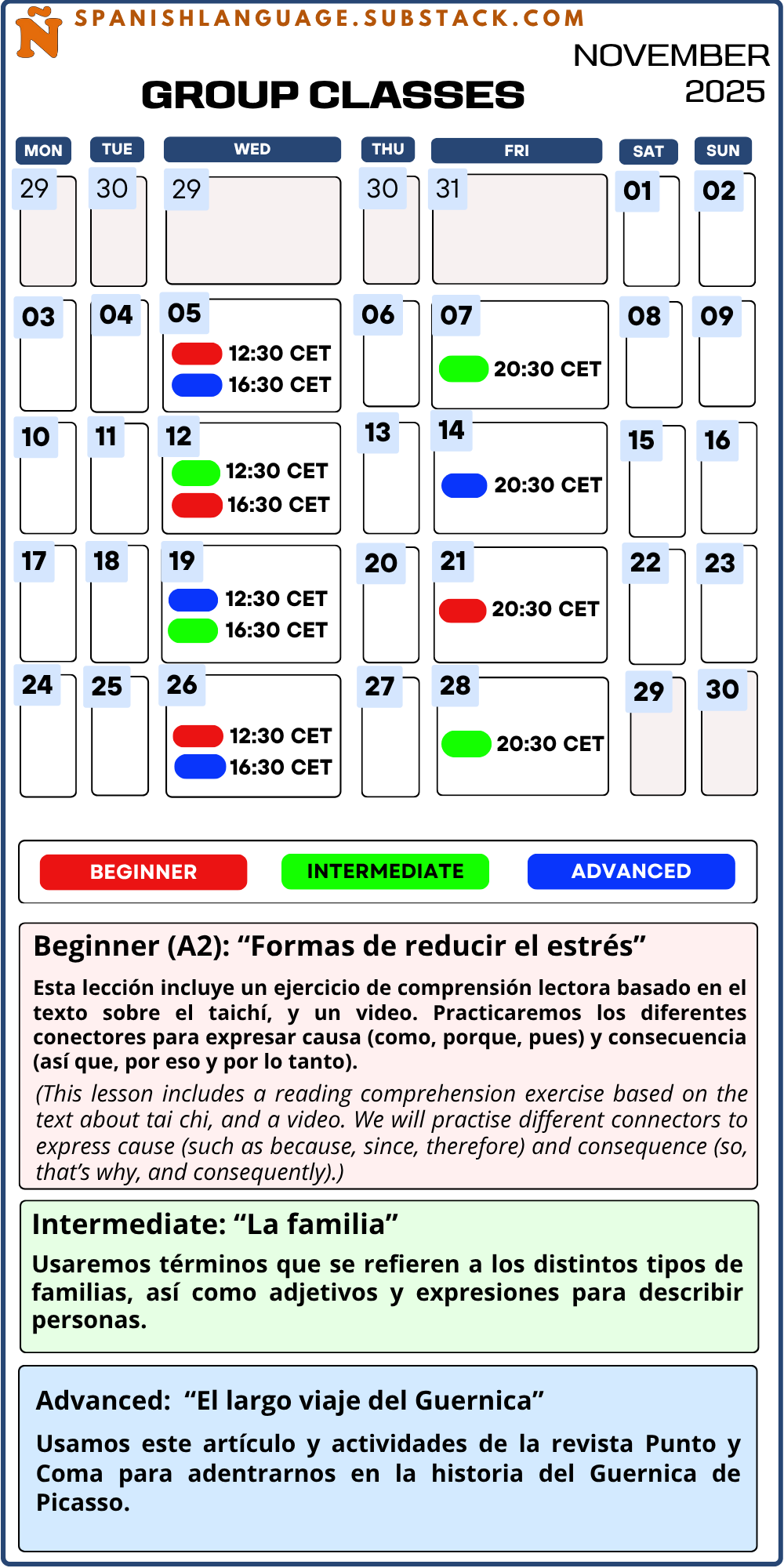 You can download here the documents corresponding to each level and you will also find the link to enroll the session you’re interested in using the corresponding form: Spanish Group Lessons. Documents and links to enter group classes (If you are not a paid member and have already bought a ticket to attend any sessions, I’ll send you the corresponding documents and links.)
