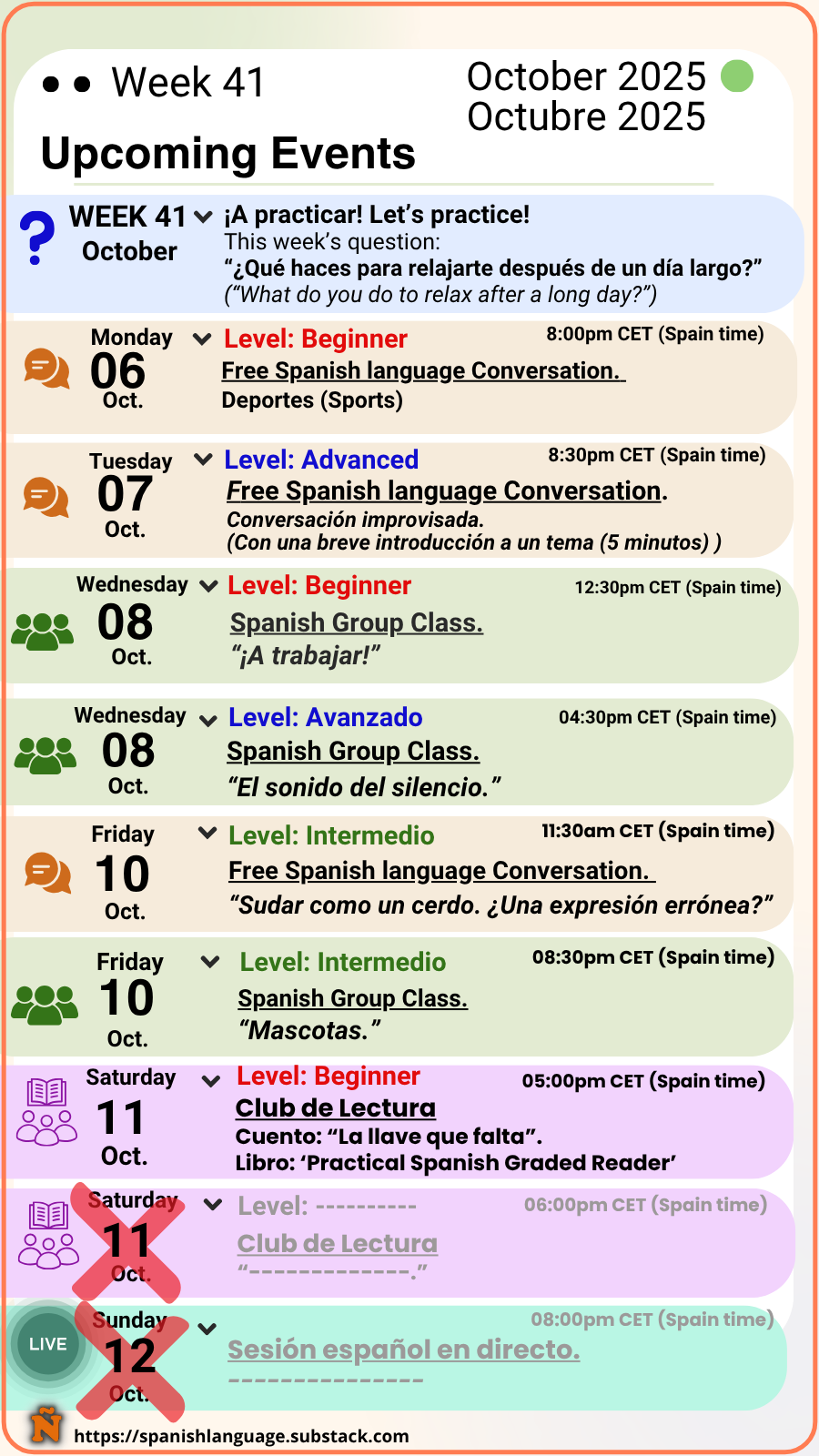 Paid members: Free to join any session, as many times as you want. Please, enroll the session you’re interested in using this link: Spanish Group Lessons. Documents and links to enter these group classes.
